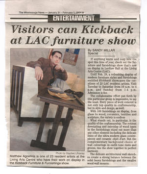 Always applying to contests and awards has generated excellent responses for Matthew’s work and has lead him to enter such commissions as the Mayor’s Awards for business and the arts. This corporate commission has lead to publications in local newspapers and excellent media coverage. Selected pieces of Matthew’s furniture have been displayed and sold at such galleries as the Wagner-Rosenbaum, One of a Kind show, Interior Design Show, Living Arts Centre and breakfast television.